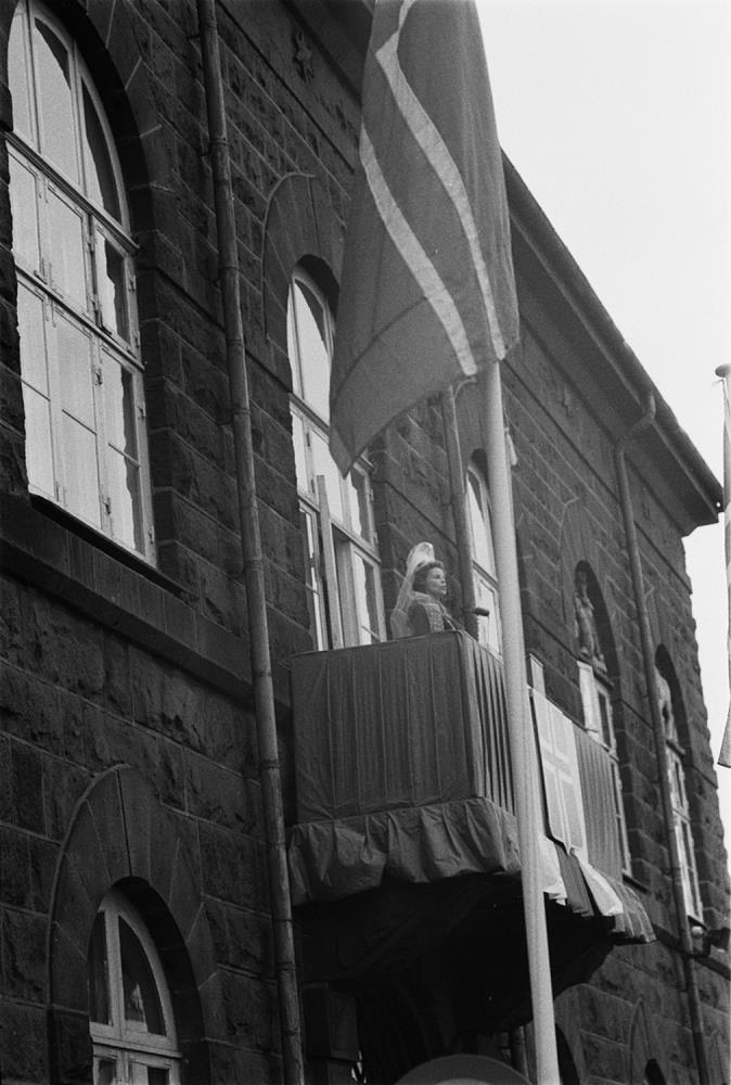 Guðrún Ásmundsdóttir leikkona á svölum Alþingishússins og flutti ávarp Fjallkonunnar sem Þorsteinn Valdimarsson skáld hafði ort.