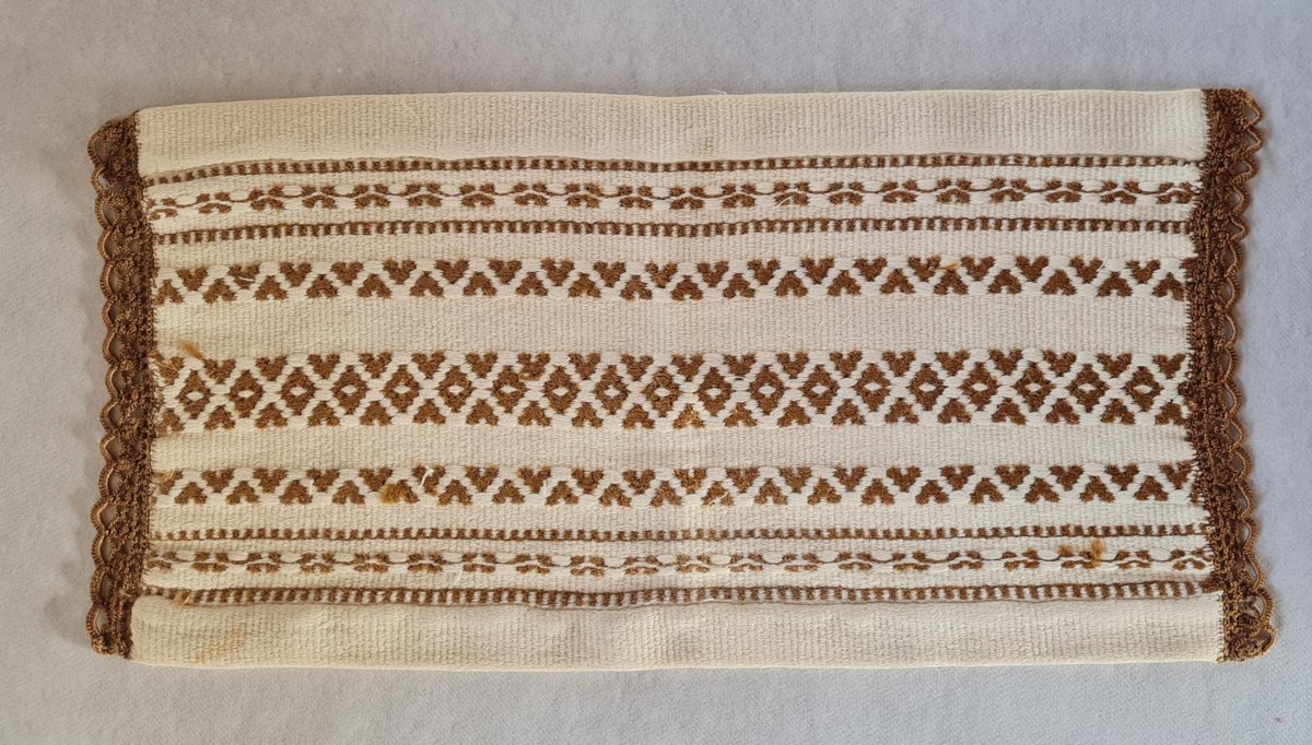 Ofinn dúkur. Rósabandavefnaður. Rjómahvítur á lit með brúnu munstri.Á endunum er hekluð blúnda úr brúnu silkigarni. Eign og handverk Oddnýjar Methúsalemsdóttur (1891-1983) húsfreyju í YtriHlíð Vopnafirði. Gefandi er dóttir hennar.