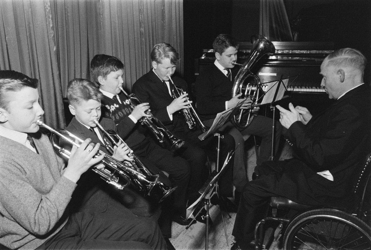 Fimm strákar spila á blásturshljóðfæri, Sigursveinn stjórnar.
