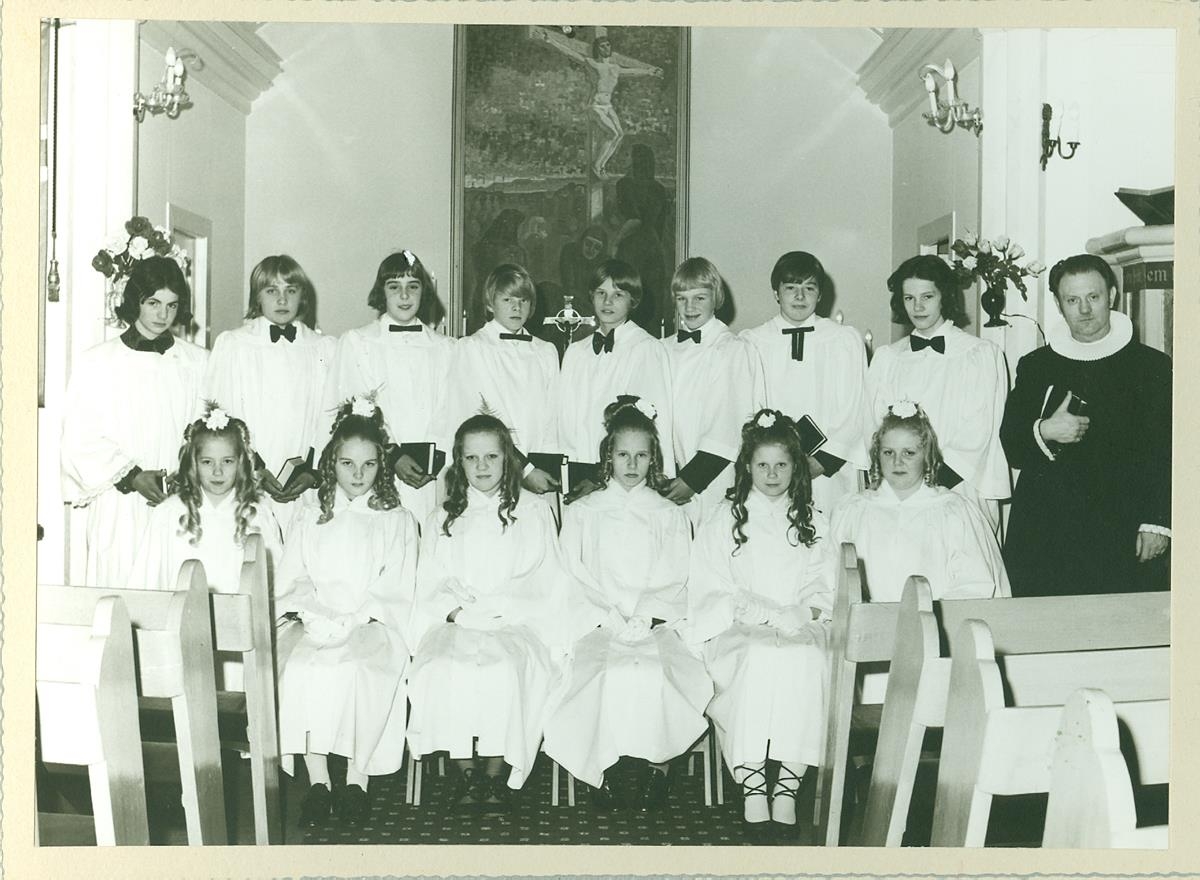 Fermingarbörn með sr. Birni Jónssyni. Úr safni sr. Björns Jónssonar sem var prestur í Keflavík frá 1952 til 1975.