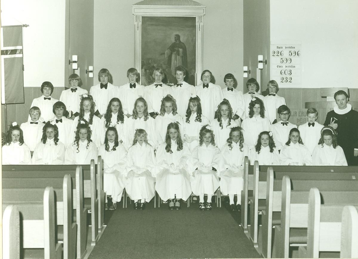 Fermingarbörn með sr. Birni Jónssyni. Árgangur 1958. Úr safni sr. Björns Jónssonar sem var prestur í Keflavík frá 1952 til 1975.