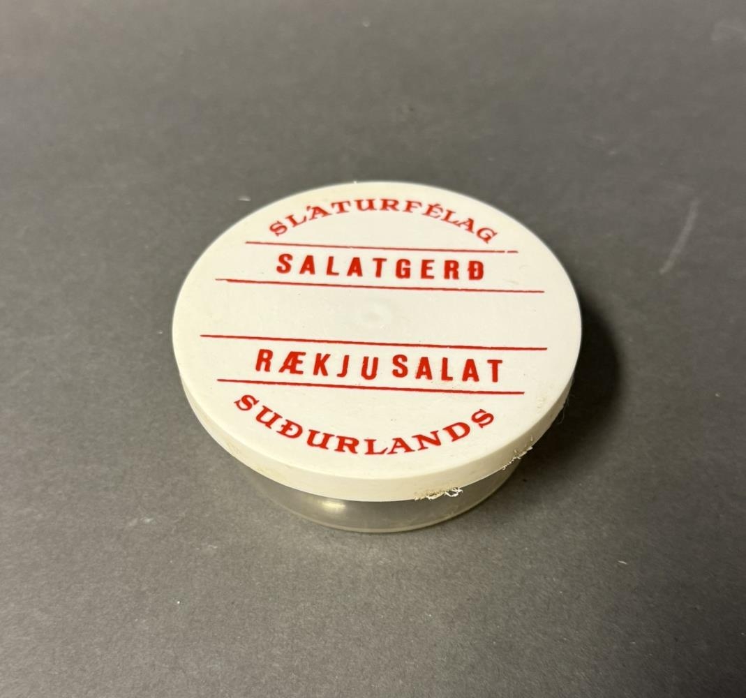 Plastdós með hvítu loki. Umbúðir fyrir rækjusalat frá Sláturfélagi Suðurlands.