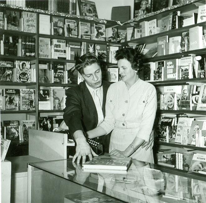 Frá Bókabúð Keflavíkur. Kristinn og Lúlla við afgreiðsluborðið