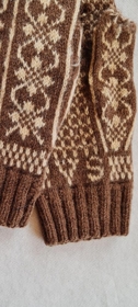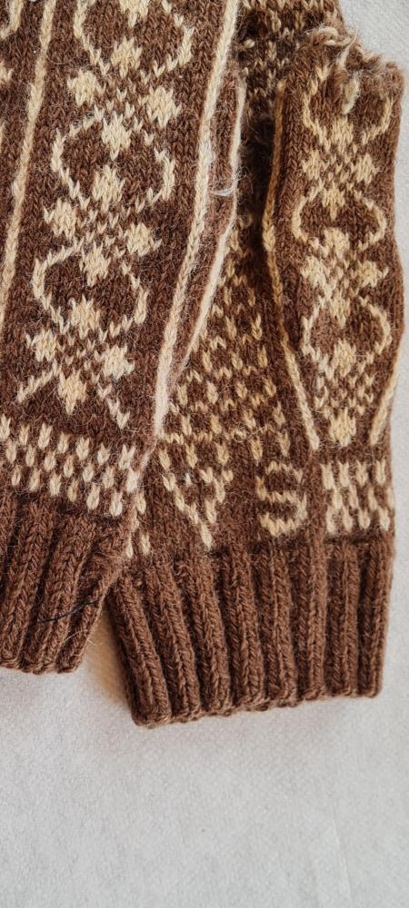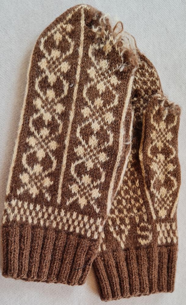 Útprjónaðir fíngerðir ullarvettlingar í ljósum og mórauðum lit. Eign og handverk Vilhjálms Sigfússonar (1904-2003) og eru upphafsstafir hans VS prjónaðir í munstrið. Vilhjálmur var lengst af til heimilis í Ytri-Hlíð Vopnafirði og vann þar þremur kynslóðum.
