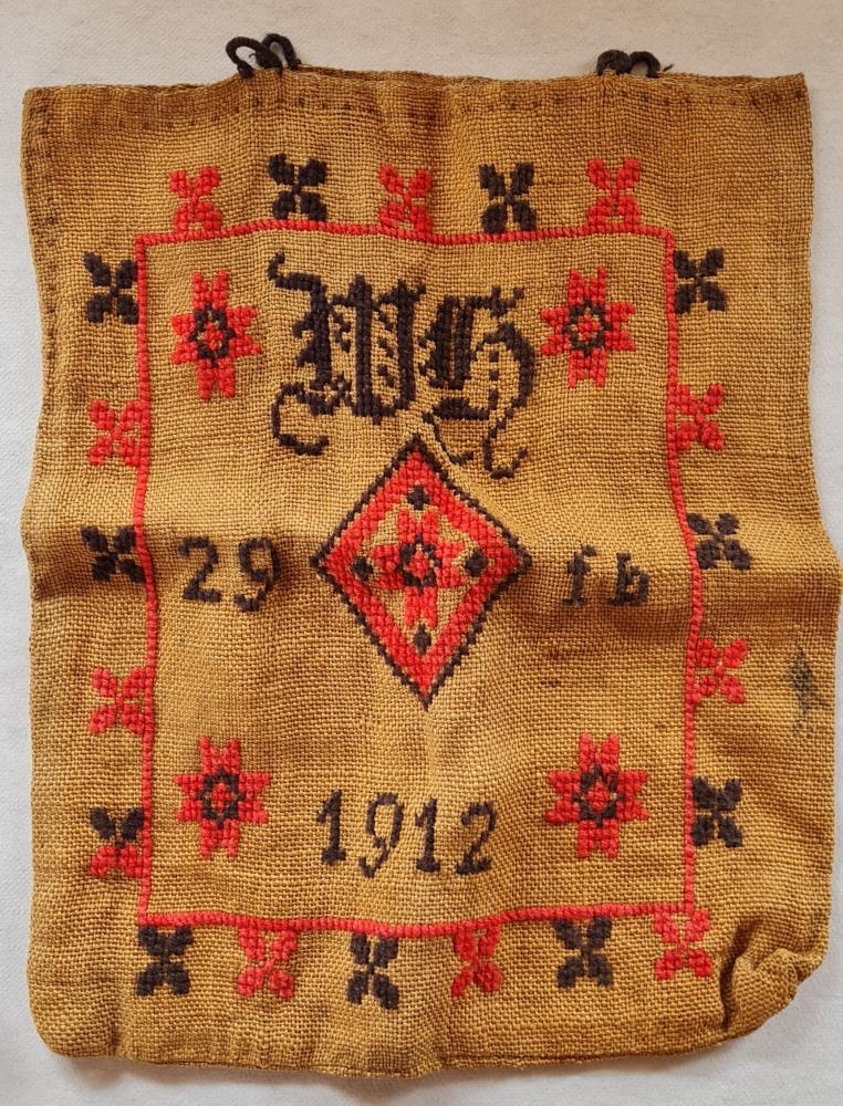Útsaumaður poki úr strigaefni. Svartir og rauðir litir.Stafirnir VH 29 fb 1912 saumaðir í. Eign Valgerðar Helgadóttur (1869-1949) húsfreyju í Ytri-Hlíð Vopnafirði. Ekki vitað hver saumaði.Gefandi er sonardóttir Valgerðar.
