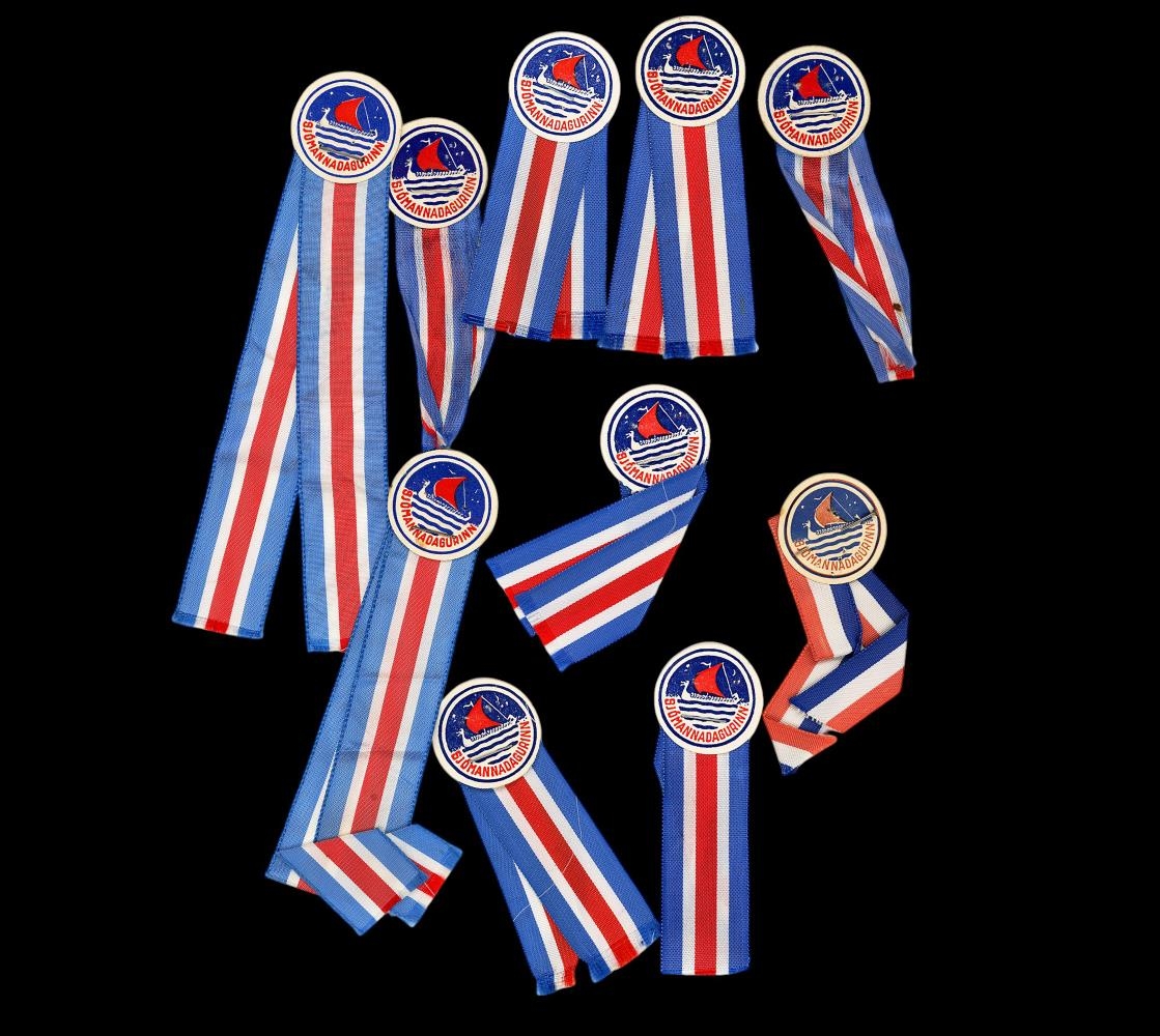 10 stk. af Sjómannadagsmerkinu og borði í íslensku fánalitunum er heft við.