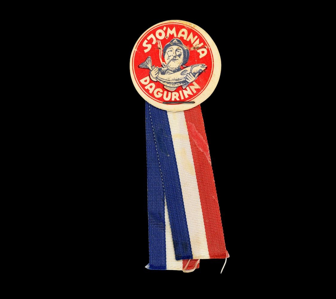 1 stk. af Sjómannadagsmerkinu og borði í íslensku fánalitunum er heft við.