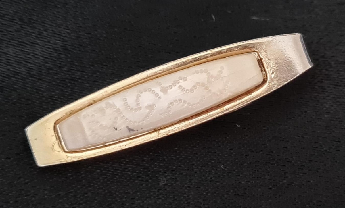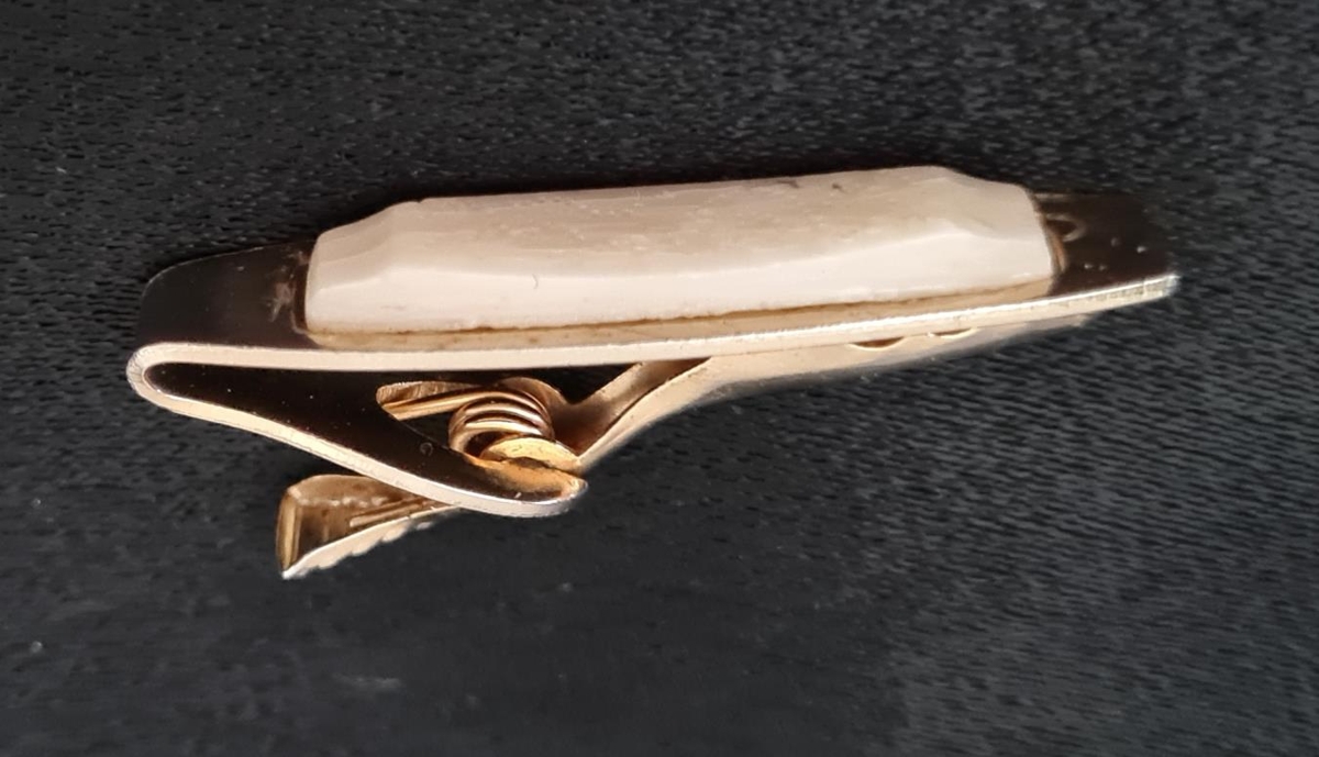 Gyllt bindisnæla neð ljósleitu skrauti. Átti Níels Gunnlaugsson (1933-2019) bóndi á Felli í Vopnafirði
