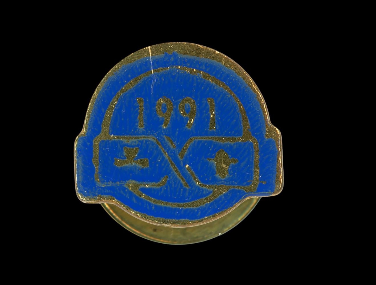 Barmmerki, gyllt í grunninn og þrykkt í blátt lógó BÍS