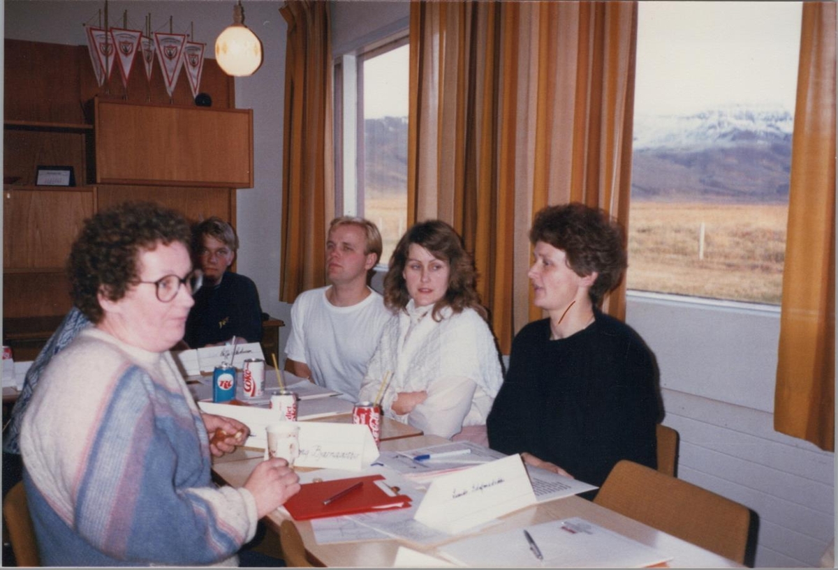 „Verkalýðsfélagið Hörður sunnan Skarðsheiðar. Námskeið frá félagsmálaskóla alþýðunnar. Námskeið haldið Heiðarborg í Leirársveit í Hvalfjarðarsveit. Frá vinstri: Rannveig Bjarnadóttir (1946-), Óþekktur, Hafþór Harðarson (1957-), óþekkt og Svandís Guðrún Stefánsdóttir (1946-).“ (NÞÁ 2025)