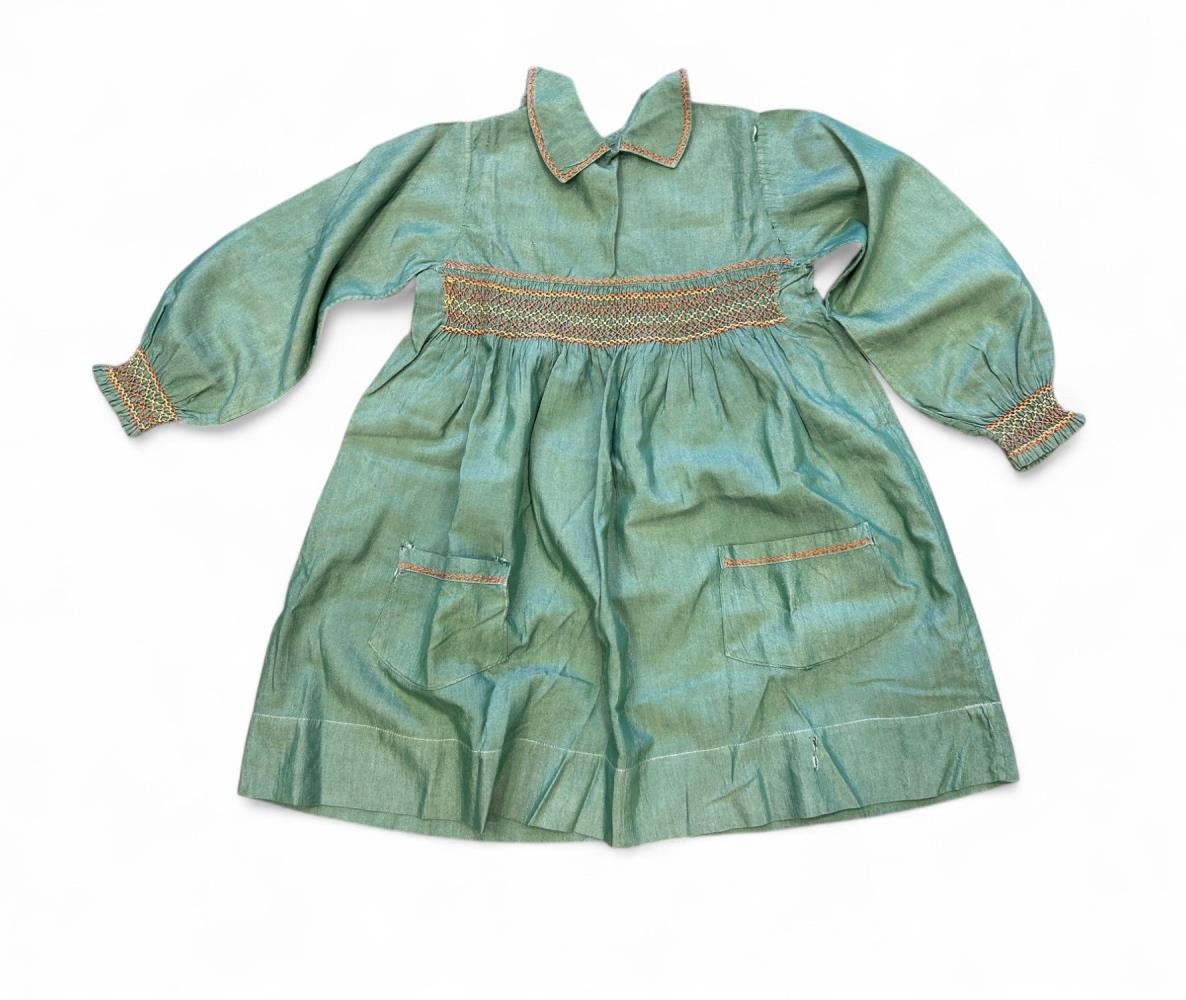 Grænn síðerma barnakjóll með vöfflusaum á berustykkir og ermum. Tveir litlir vasar. Saumaður á Bryndísi Þorsteinsdóttur. Móðir hennar, Guðrún Geirsdóttir Zoëga, saumaði.