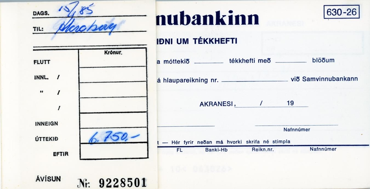 Ávísanahefti / tékkreikningur frá Samvinnubankanum og var notaður árið 1985.