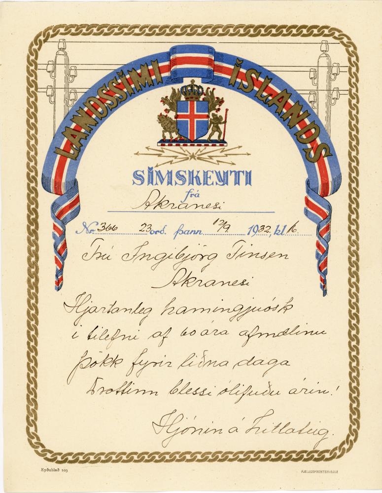 Heillaóskaskeyti til Ingibjargar Ísleifsdóttur Finsen (1872-1936) í tilefni af 60 ára afmæli frá hjónunum á Litla-Teig.