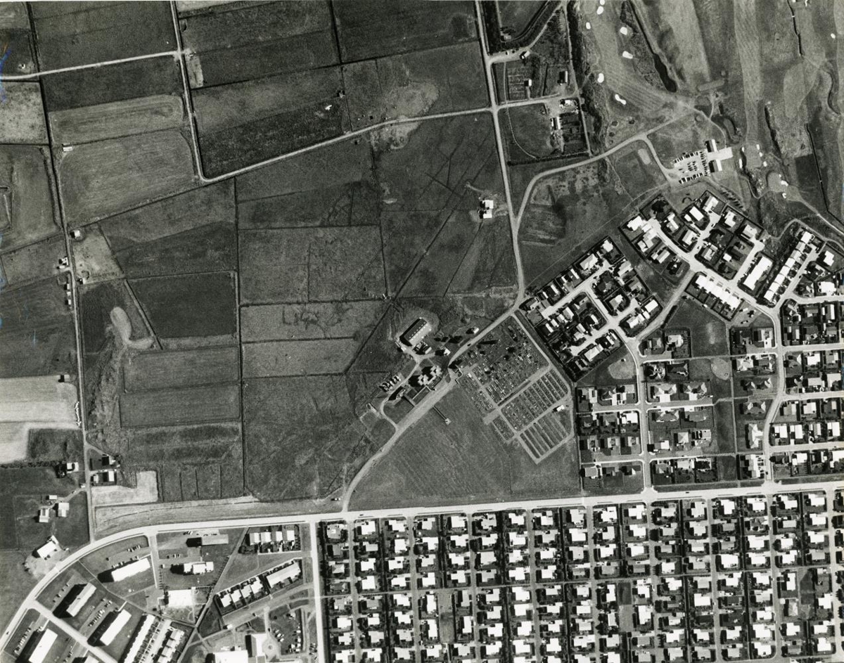 Loftmynda af Byggðasafninu í Görðum, kirkjugarðinum og nágrenni.