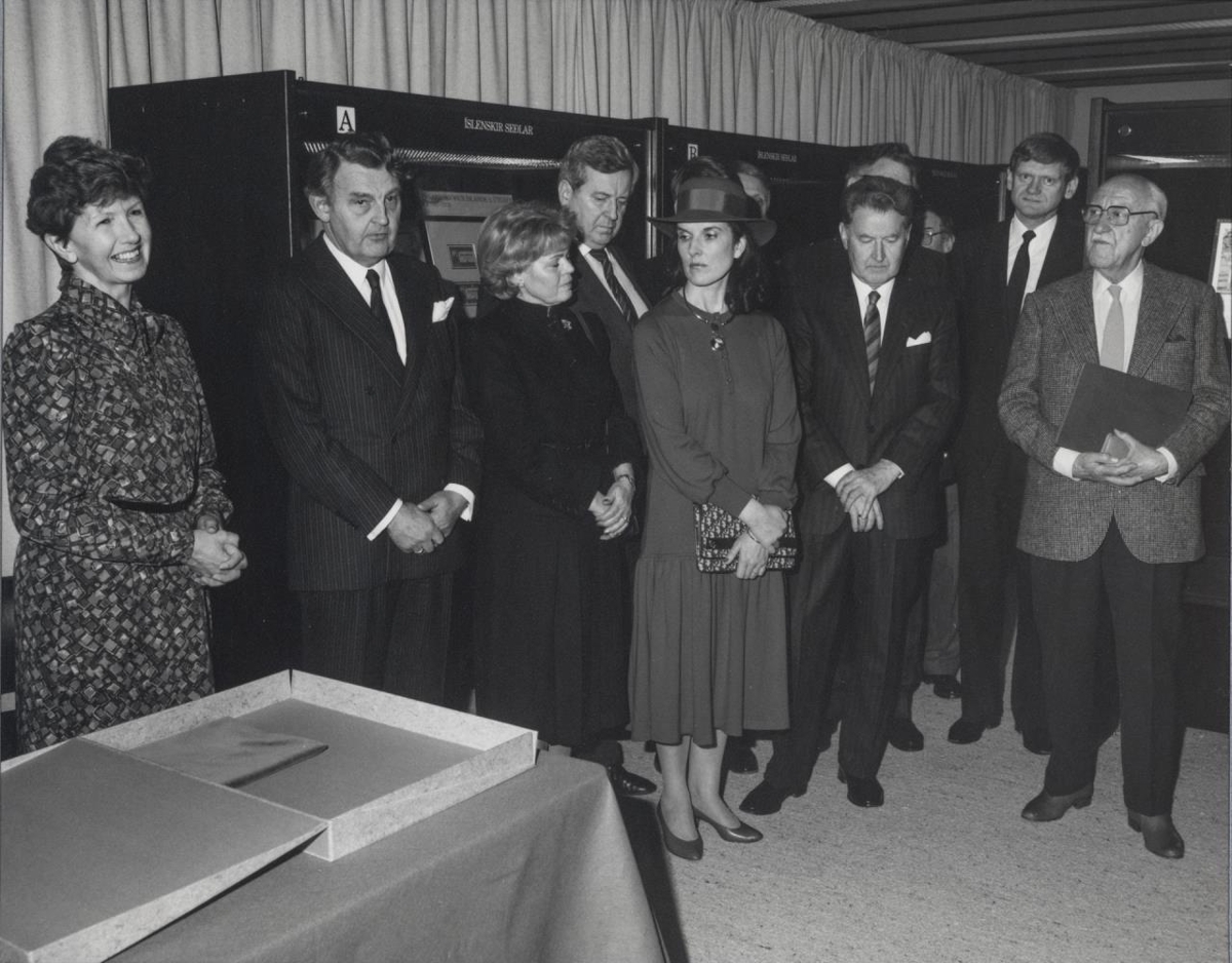 Ragnhildur Helgadóttir menntamálaráðherra, Jóhannes Nordal seðlabankastjóri, Tómas Árnason, Þór Magnússon og Halldór Laxness.