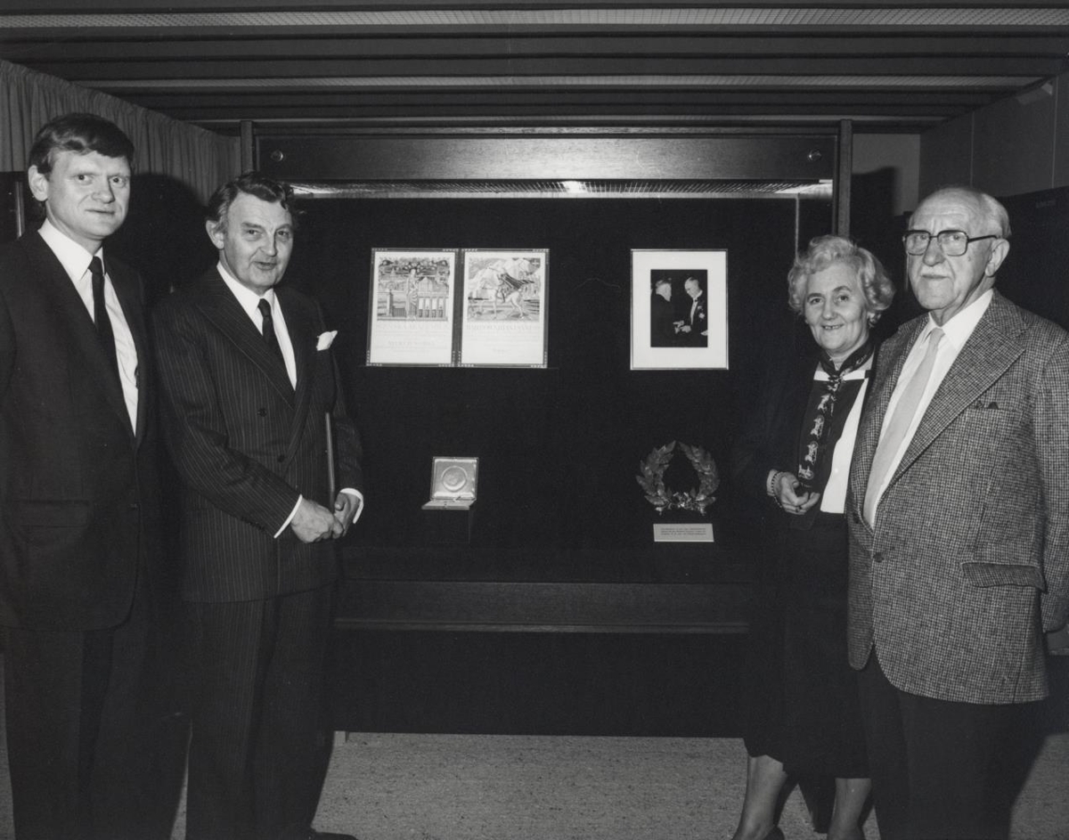Halldór Laxness afhenti Seðlabanka Íslands og Þjóðminjasafns Íslands, Nóbelsverðlaunin og heiðursskjöl til varðveislu árið 1985. Á myndinni sem tekin var við þessa afhendingarathöfn eru Þór Magnússon þjóðminjavörður, Jóhannes Nordal seðlabankastjóri, Halldór Laxness og Auður Sveinsdóttir.