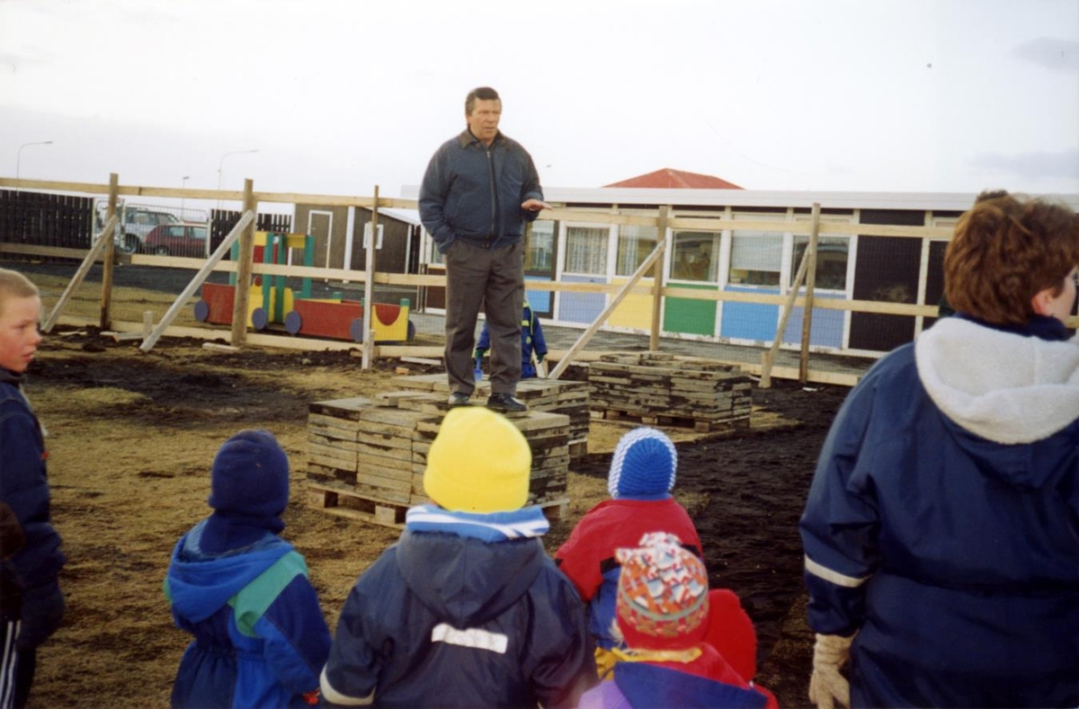 Framkvæmdir hafnar við byggingu á nýju leikskólahúsnæði fyrir leikskólann Gefnarborg í Garði árið 1998. Nýi skólinn var byggður á lóð þess gamla. Hér kynnir Sigurður Ingvarsson þáverandi oddviti Gerðahrepps fyrirhugað verkefni. Myndin er úr ljósmyndasafni sem Hafrún Ólöf Víglundsdóttir fyrrum leikskólastjóri Gefnarborgar afhenti byggðasafninu árið 2024. Myndasafnið er frá árunum 1976 til ársins 2000.