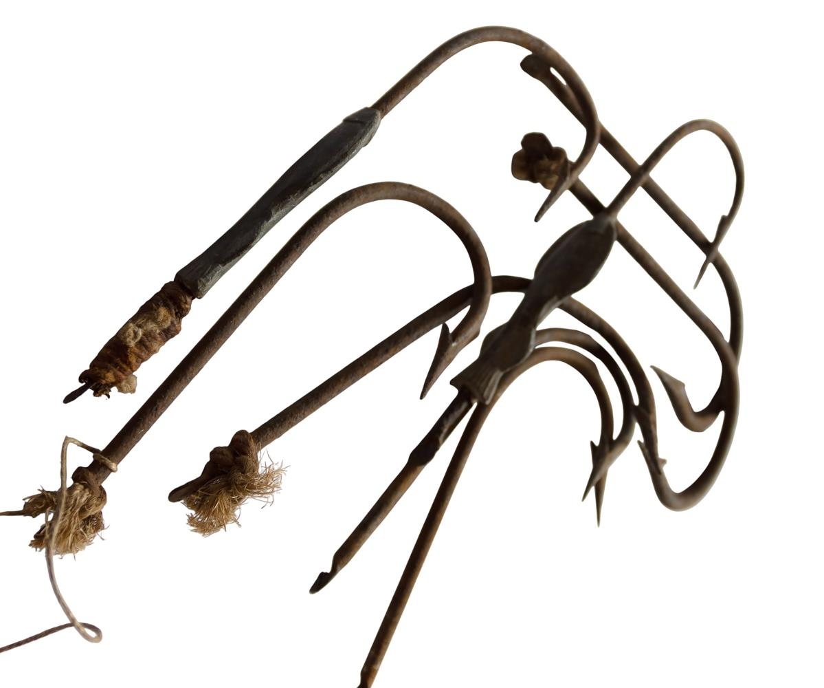 8 stk. af skötulóðarönglum, sem eru ryðgaðir.