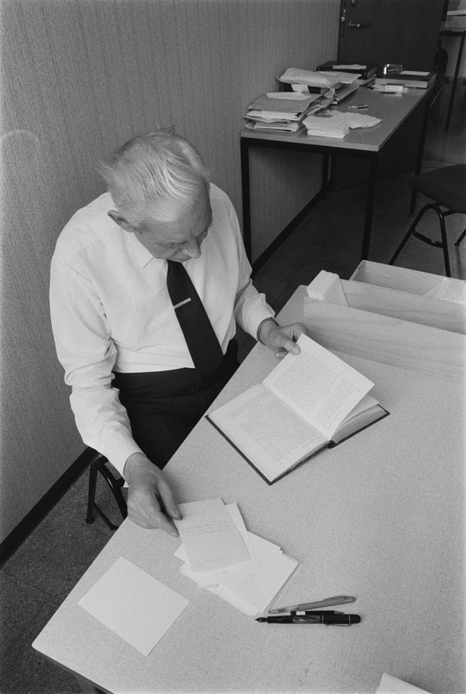 Ásgeir Blöndal Magnússon situr við skrifborð og skoðar bók.