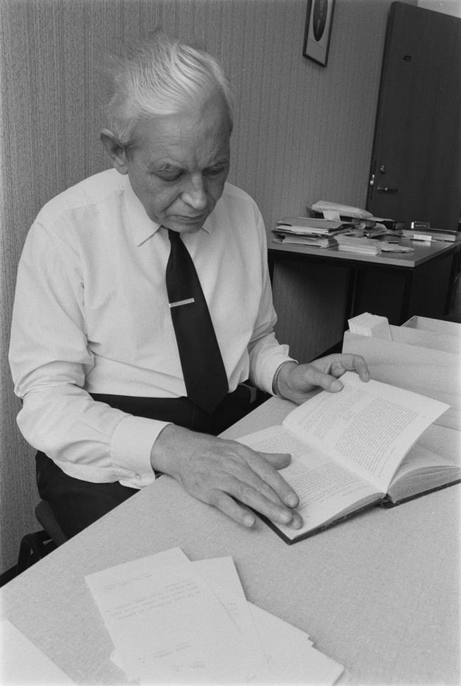 Ásgeir Blöndal Magnússon situr við skrifborð og skoðar bók.