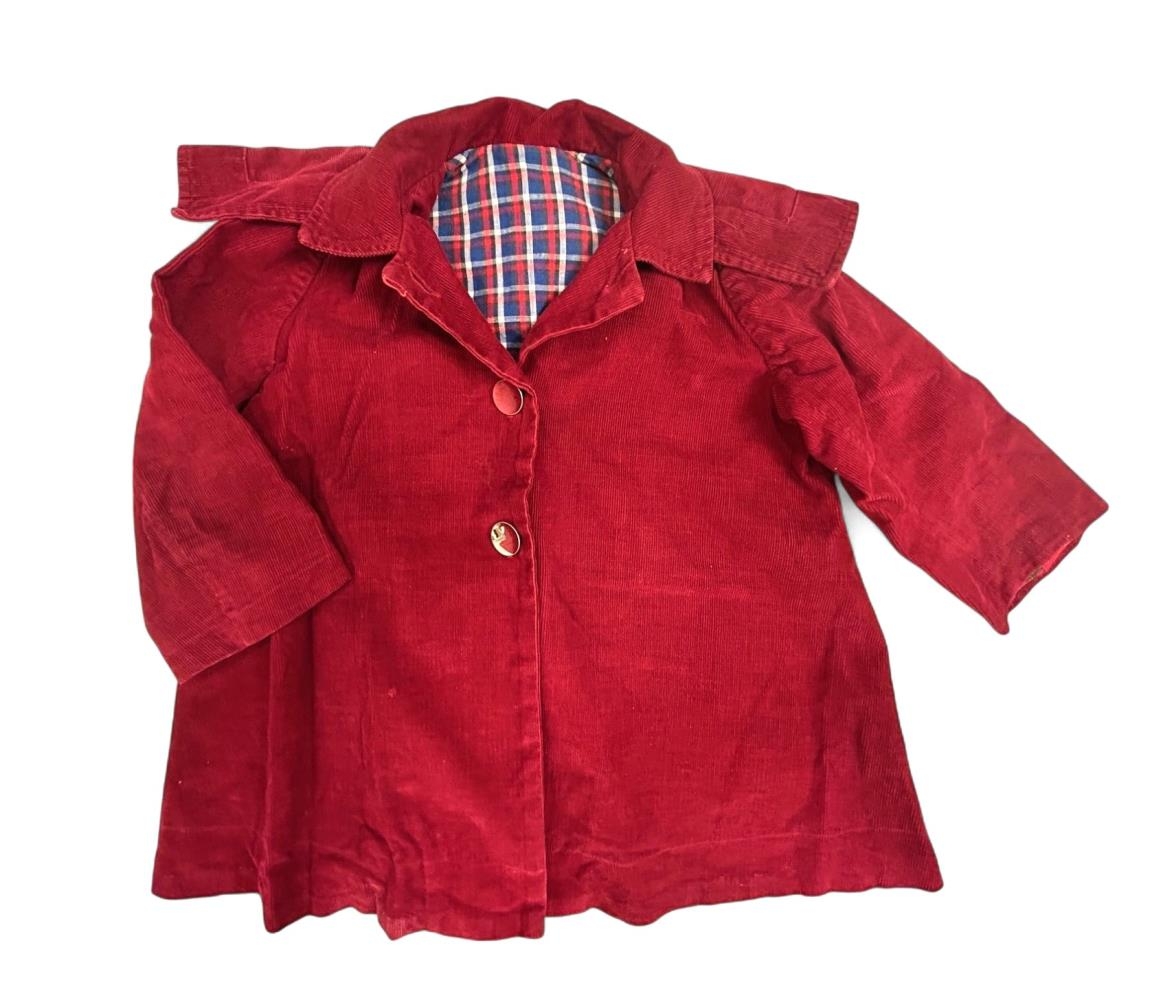 Kápa úr rauðu fíngerðu, riffluðu flaueli með breiðu axlastykki/axlahlíf? neðan við kraga. Fóðruð með köflóttu bómullarefni.