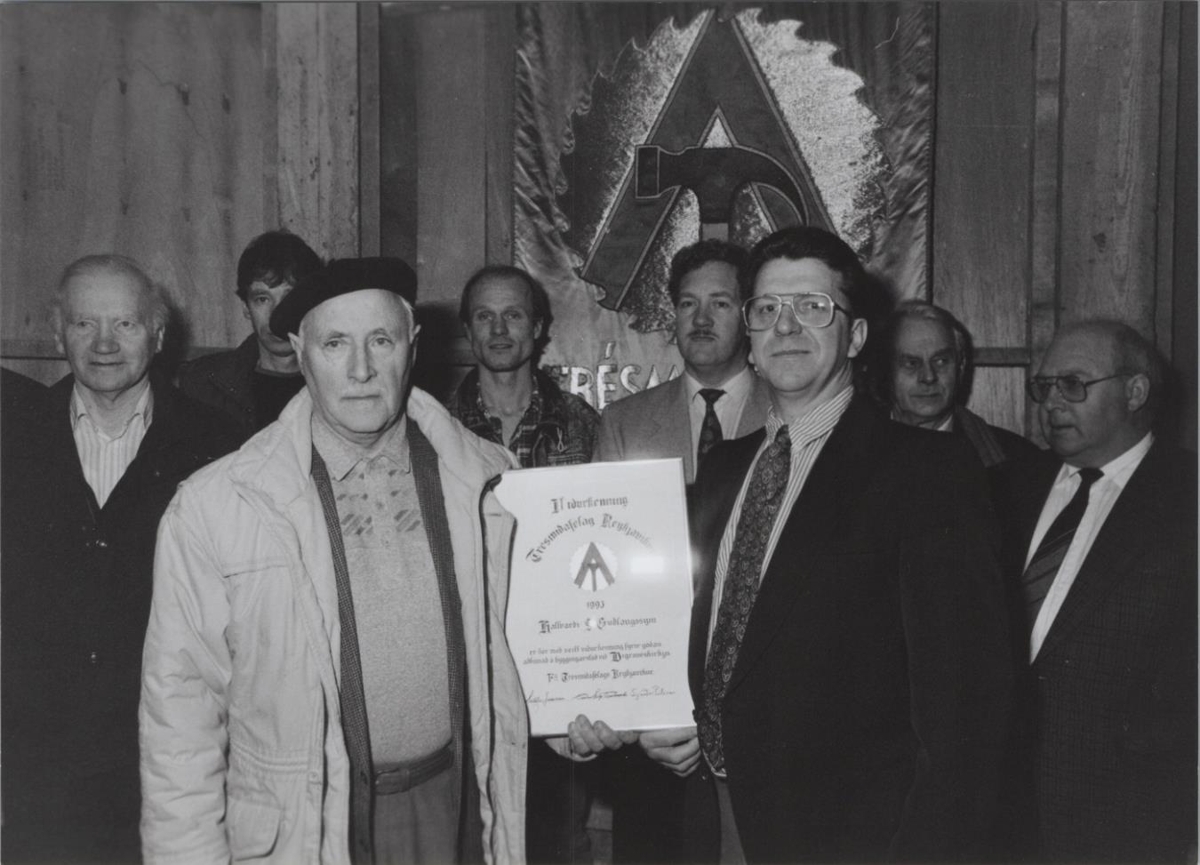 Trésmiðafélag Reykjavíkur afhendir viðurkenningu fyrir aðbúnað á vinnustað. Hallvarður Guðlaugsson tekur við viðurkenningarskjali úr hendi Halldórs Jónssonar hjá TR