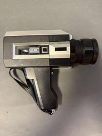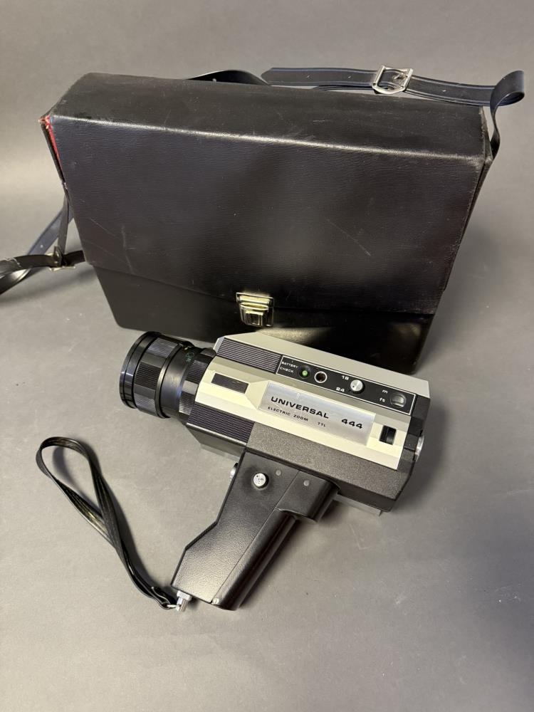 Kvikmyndatökuvél, Universal 444. Super 8 mm. Framleiðandi Bencini Ítalía 1977. Gengur fyrir 4 AA rafhlöðum sem komið er fyrir í handfangi. í svartri vinyltösku.