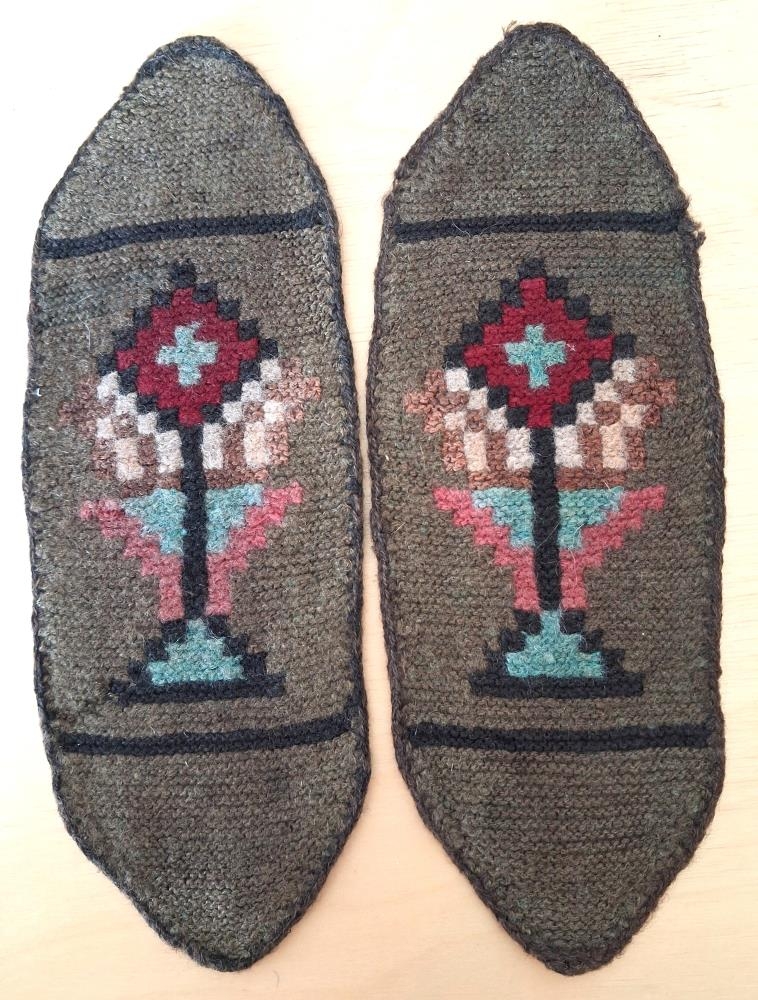 Dökkbrúnir leppar prjónaðir með garðaprjóni. Í miðju er stundaglas, litir, svartur, vínrauður, ljósgrænn, bleikur, ljós og dökkbrúnn. Dökkbrúnar renndur eru fyrir ofan og neðan munstrið.
