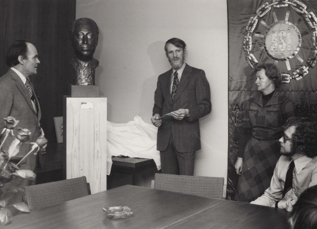 Bókbindarafélag Íslands afhendir ASÍ styttu af Guðgeiri Jónssyni fyrrverandi forseta ASÍ í tilefni af 60 ára afmælis ASÍ 12. mars 1976. Svanur Jóhannesson, formaður Bókbindarafélags Íslands afhendir Birni Jónssyni forseta ASÍ gjöfina. Á myndinni eru einnig konan sem afhjúpaði styttuna og maður sem situr við borð. Mynd merkt: Ljósmyndastofa Þóris.