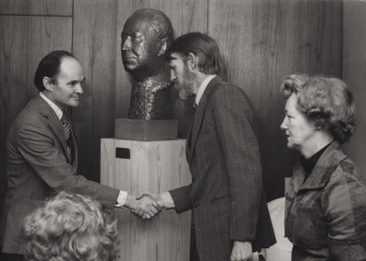 Björn Jónsson, forseti ASÍ, tekur á móti styttu af Guðgeiri Jónssyni, forseta ASÍ, frá Bókbindarafélagi Íslands. Svanur Jóhannesson formaður afhendir og þeir takast í hendur, 12. mars 1976. Einnig er kona á myndinni sem afhjúpaði styttuna. Myndin er merkt: Ljósmynastofa Þóris.