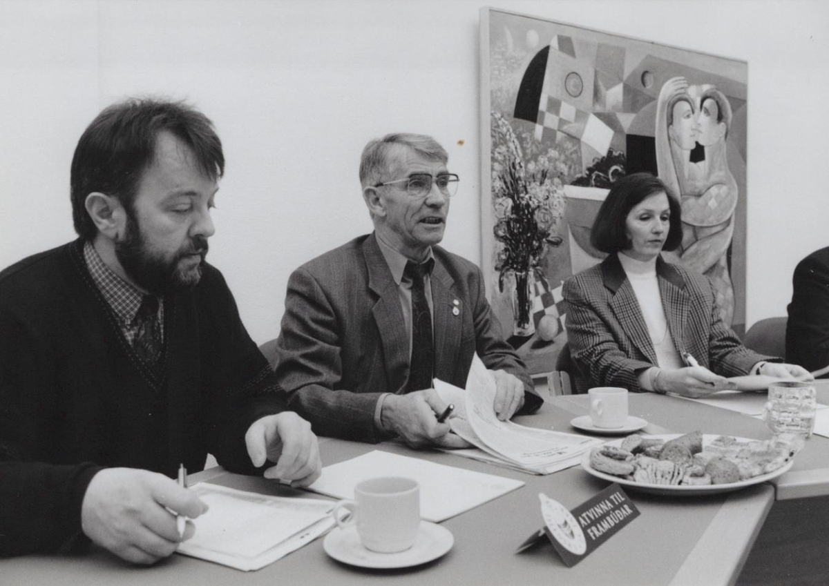 Forsetar ASÍ kynna ákvörðun launanefndar í nóvember 1993 um að segja ekki upp kjarasamningum. Hervar Gunnarsson, Benedikt Davíðsson og Ingibjörg R. Guðmundsdóttir. Mynd: Róbert.