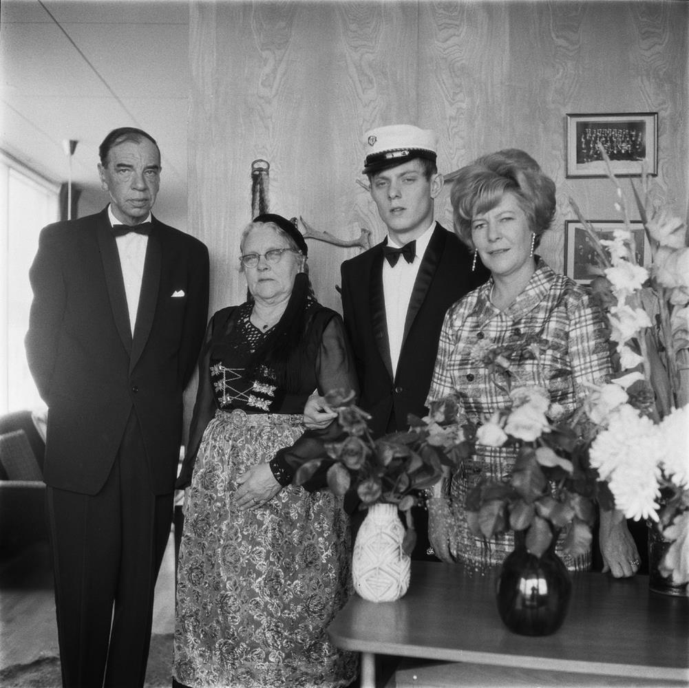 Ásgeir Hjartarson bókavörður og fjölskylda hans, ungur maður með stúdentshúfu á myndunum.