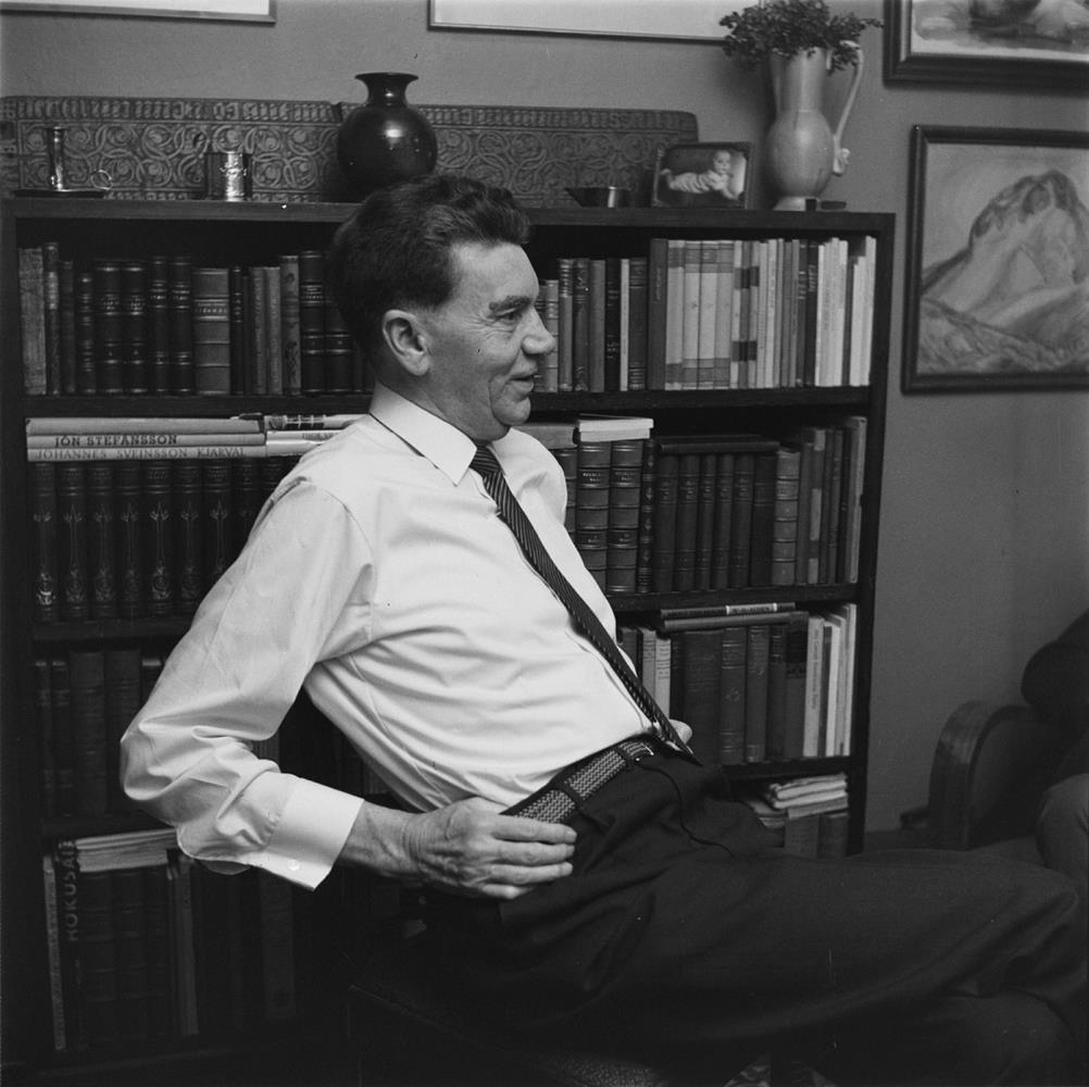 Snorri Hjartarsson skáld, situr í stól við bókahillu.