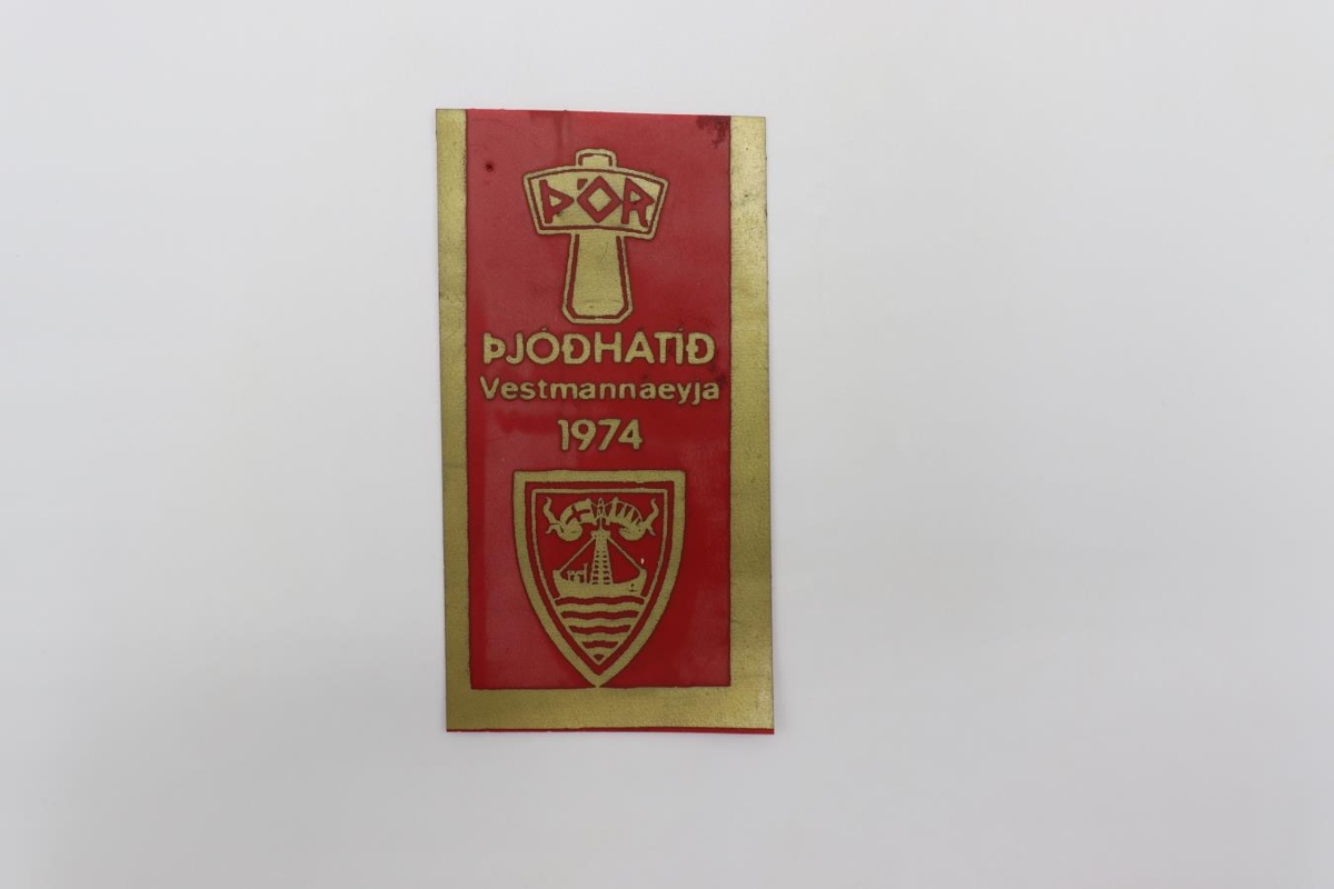 Þjóðhátíðarmiði frá 1974. Rauður og gylltur miði sem festur var í föt eiganda. Grunnur er rauður, ramminn um miðan (á 3 hliðum) er gylltur, merki Þórs íþróttafélags er efst á miða, þar fyrir neðan stendur "ÞJÓÐHÁTÍÐ Vestmannaeyja 1974" og þar fyrir neðan er skjaldamerki Vestmannaeyjabæjar. Miði var festur með sikkrisnælu.
