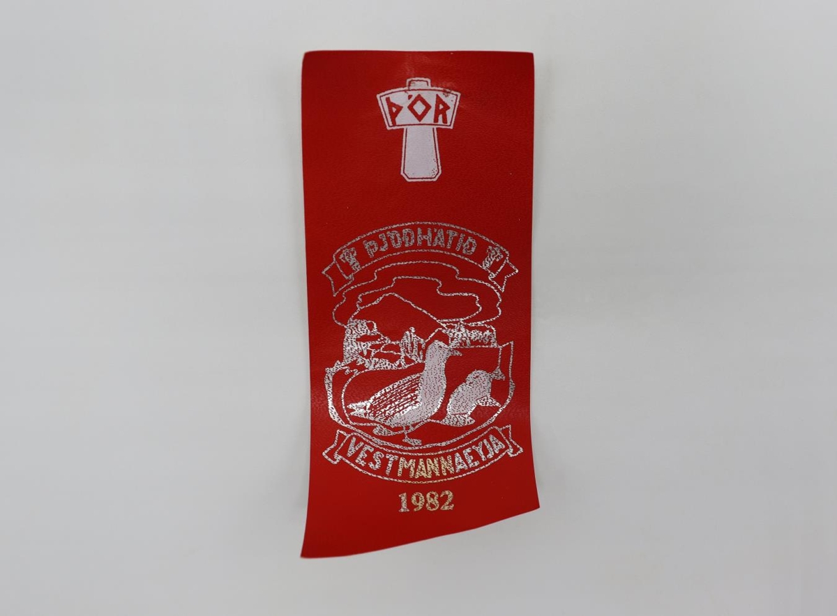 Þjóðhátíðarmði frá 1982. Rauður grunnur með silfruðu skrauti. Efst á miða er merki Þórs íþróttafélags, hvítt að lit. Á miðjum miða er silfurlituð mynd með fýl og unga með Heimaklett og enda Ystakletts í bakgrunni. Texti umlykur myndina, fyrir ofan er merki Þórs svo "Þjóðhátíð" og aftur merki Þórs, fyrir neðan stendur "Vestmananeyja". Neðst á miða stendur "1982". Miði var festur á með sikkrisnælu.