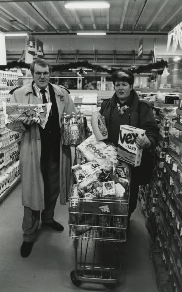 Þórunn Sveinbjörnsdóttir, formaður Sóknar, og Guðmundur Þ. Jónsson formaður Iðju, Reykjavík að "kaupa íslenskt". Mynd: Vinnan/Róbert des. 1992. ASÍ 91.