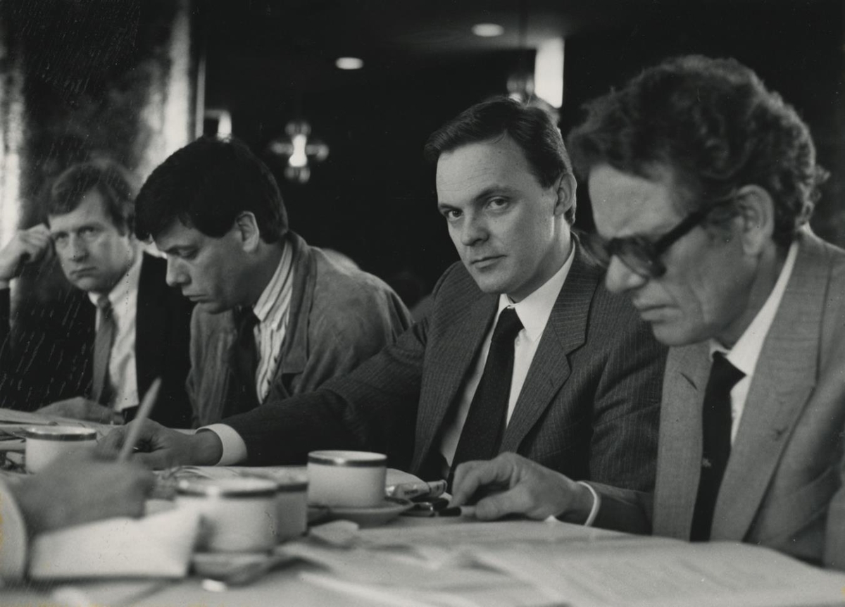 Frá aðalfundi Alþýðubankans hf. 1988. Frá vinstri: Jón Agnar Eggertsson formaður Verkalýðsfélags Borgarness, Jóhannes Siggeirsson Lífeyrissjóði Málm og skip. Björn Björnsson bankastjóri Alþýðubankans og Magnús Geirsson formaður Rafiðnaðarsambands Íslands, Mynd: Vinnan. ASÍ 92.