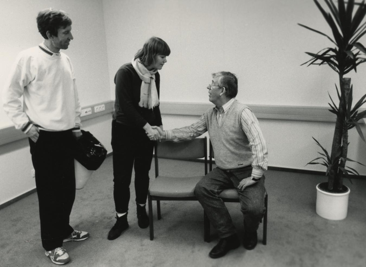 Karlar óskast í kór, uppfærsla MFA á vinnustöðum, feb. 1993. Sigurður Skúlason, Ólafía Hrönn Jónsdóttir og Bessi Bjarnason.