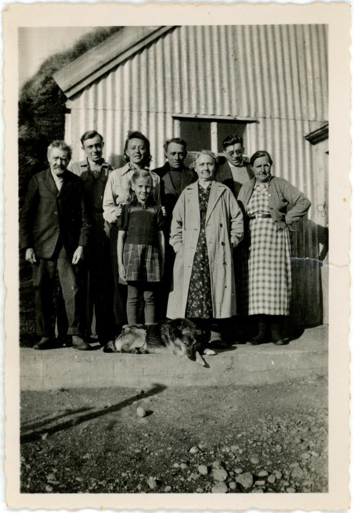 Frá vinstri. Skúli Guðbrandsson, Guðjón Skúlason, María Sigurrós Skúladóttir, Unnur Valdimarsdóttir (barnabarn Skúla og Helgu), Aðalsteinn Skúlason, Helga Markúsdóttir, Óþekktur karlmaður og Kristlaug Markúsdóttir.