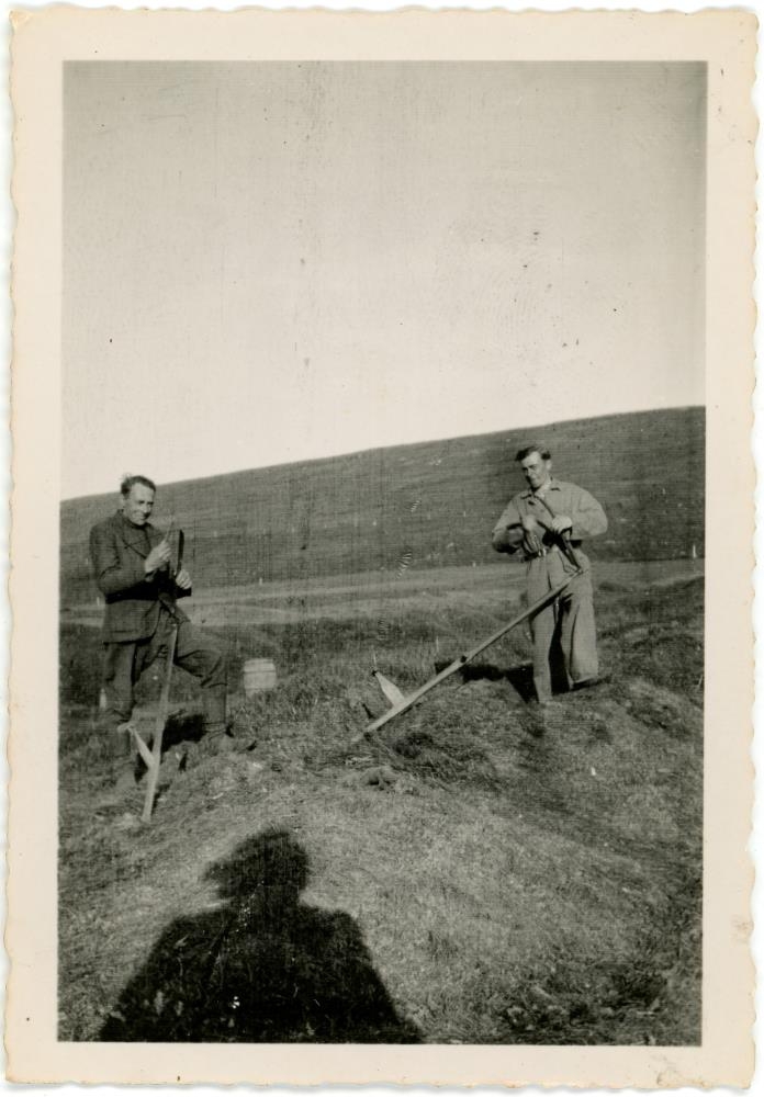 Hornstaðabræður Aðalsteinn og Guðjón að brýna ljáina fyrir sláttinn.