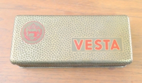 Saumavél af gerðinni "VESTA - L O Dietrich - Altenburg". Svórt á litinn og mikið skreytt með gylltum og rauðum teikningum. Vélin er geymd í fallegum tréskáp og er tekin upp um lok ofan á skápnum. Einnig fylgir vélinni smár blikkkassi með ýmsum fylgihlutum vélarinnar. Kassinn sjálfur er merktur "VESTA".