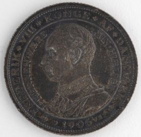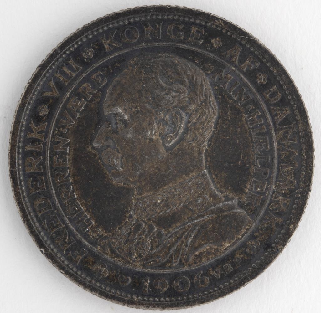 Mynt. Minnispeningur sleginn til minningar um valdaskiptin í Danmörku árið 1906 er Kristján IX konungur Danmerkur féll frá og sonur hans Friðrik VIII tók við krúnunni. Þvermál 3 cm.