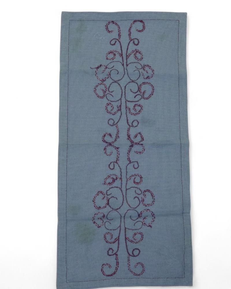 Lítill dúkur / borðrenningur, unninn í gagnfræðadeild Öldutúnsskóla 1972-1975. Rannveig teiknaði munstrið í dúkinn. Útsaumsspor: Leggsaumur (kontorstingur, varpleggur), afturstingur, ídreginn afturstingur og snúið lykkjuspor. Saumaður er afturstingur allan hringinn utan um dúkkinn. Faldurinn er brotinn upp að saumsporinu og saumaður niður í höndum með því að stinga nálinni í saumsporin á röngunni. Stærð 27 x 59 sm. Skylduvinna samkvæmt námskrá 1960.