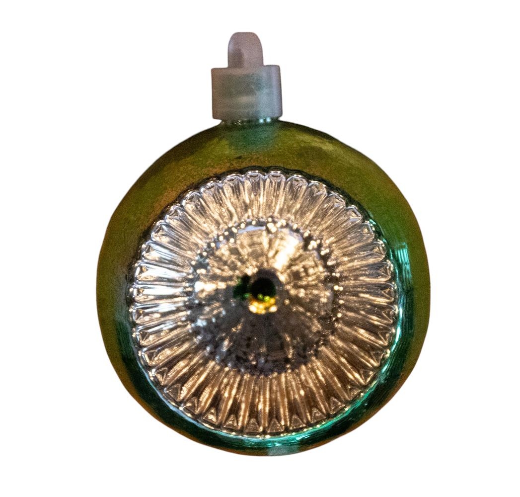 Græn jólakúla með silfurlitri innfeldri miðju.
