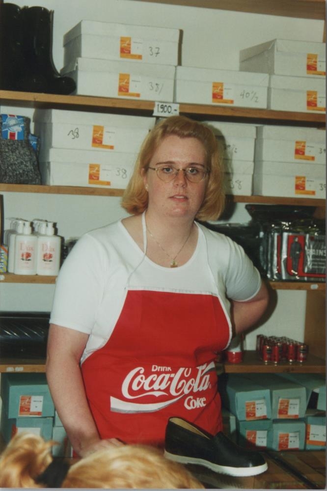 Perla Fanndal, afgreiðslukona með gúmmískó í verslun á Siglufirði.