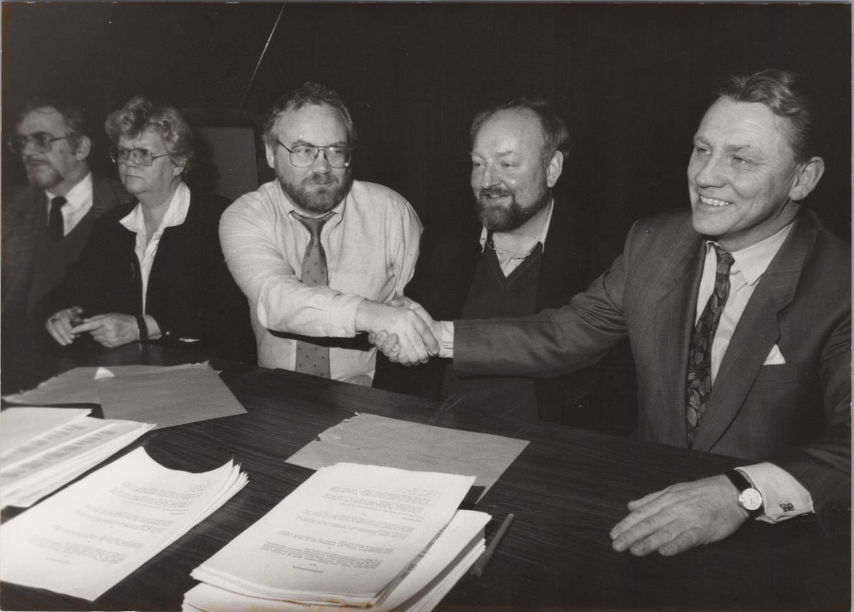Samningar, þjóðarsáttin undirrituð, m.a. Ásmundur Stefánsson og Einar Oddur Kristjánsson. Mynd: Róbert/Vinnan 1990.
