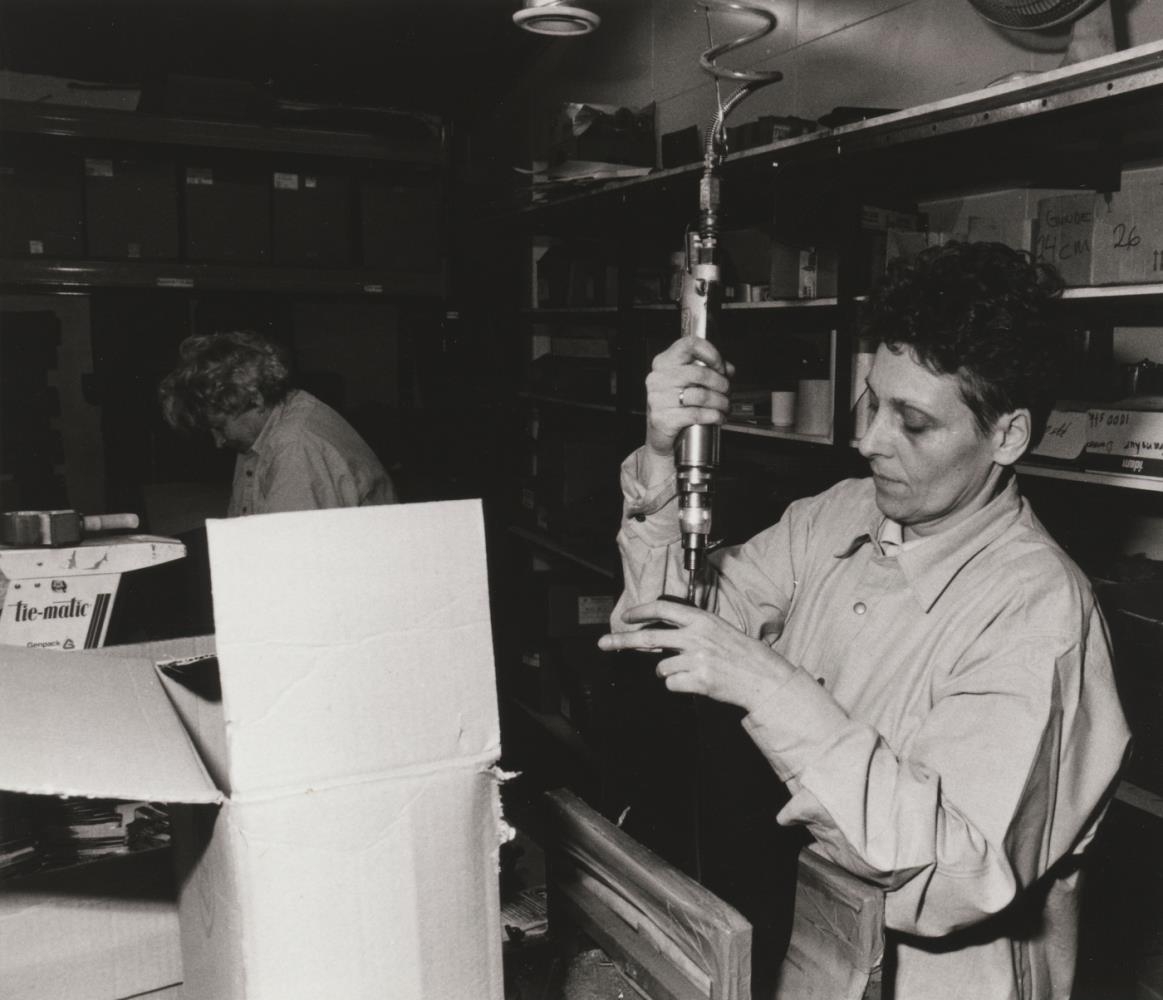 Starfsfólk hjá Alpan, pönnuverksmiðju á Eyrarbakka við vinnu, árið 1992. Mynd: Róbert.