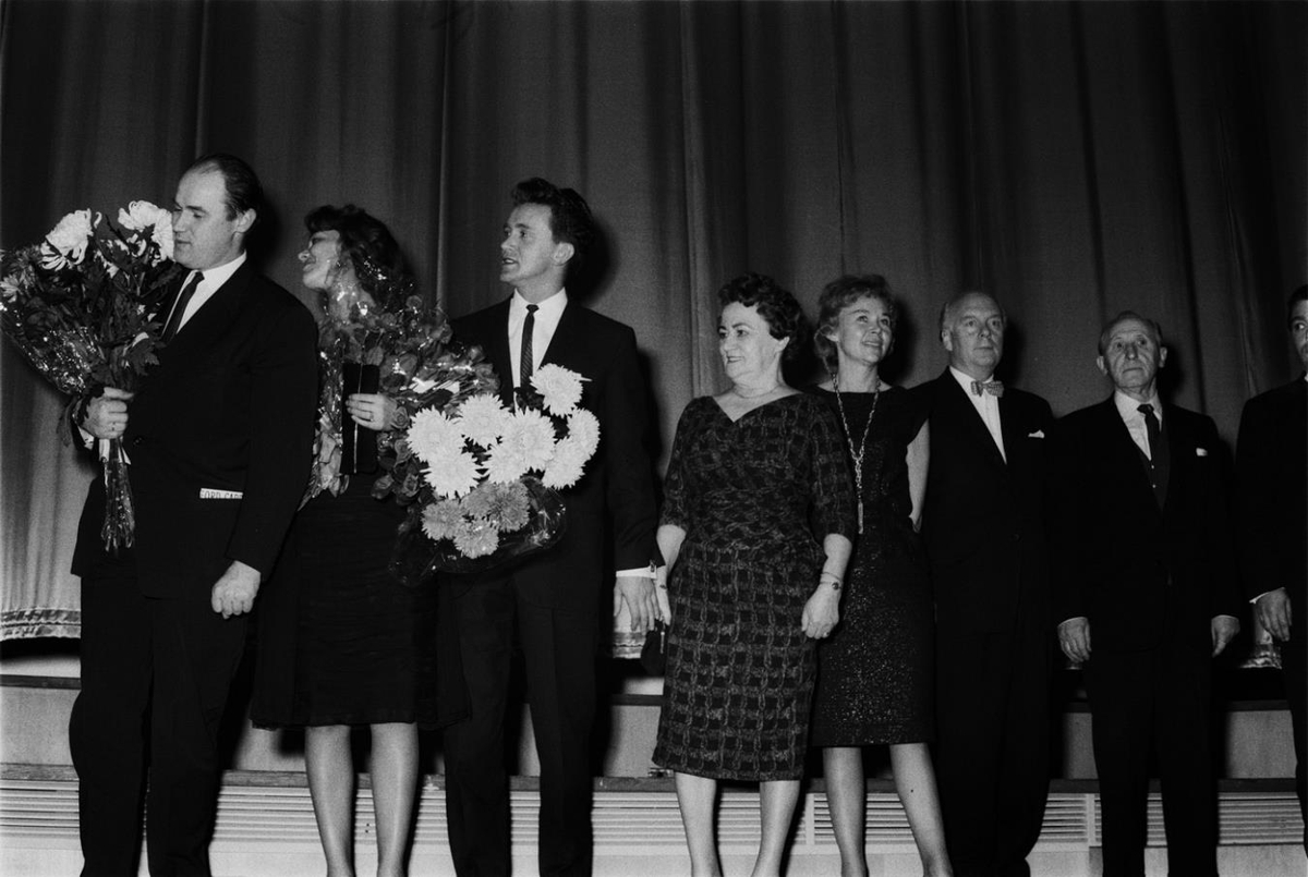 Á sviðinu í Háskólabíó að lokinni frumsýningu. Róbert Arnfinnsson, Kristbjörg Kjeld, Gunnar Eyjólfsson, Nína Sveinsdóttir, Herdís Þorvaldsdóttir, Haraldur Björnsson og ?