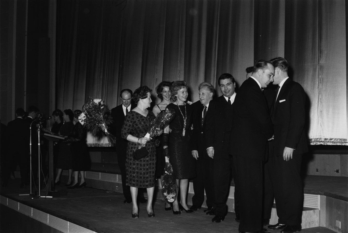Á sviðinu í Háskólabíó að lokinni frumsýningu. Þarna eru flestir leikara myndarinnar, á samt höfundi skáldsögunnar. Frá vinstri: Róbert Arnfinnsson, Nína Sveinsdóttir, Kristbjörg Kjeld, Herdís Þorvaldsdóttir, Haraldur Björnsson, Flosi Ólafsson og Indriði G Þorsteinsson (hann skyggir á leikarna Baldvin Halldórsson og Klemenz Jónsson).