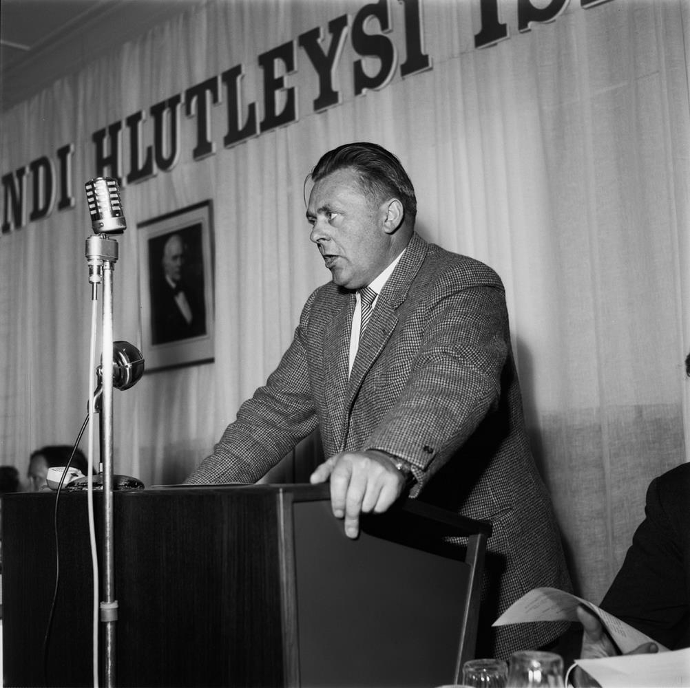 Gils Guðmundsson heldur ræðu á fundi samtaka hernámsandstæðinga.